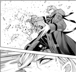 オリミラさんの銃口にコピミラさんの銃弾が入りこみ、銃を破壊する場面にござった…